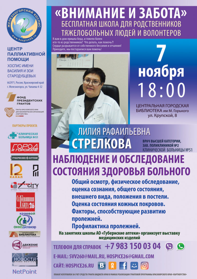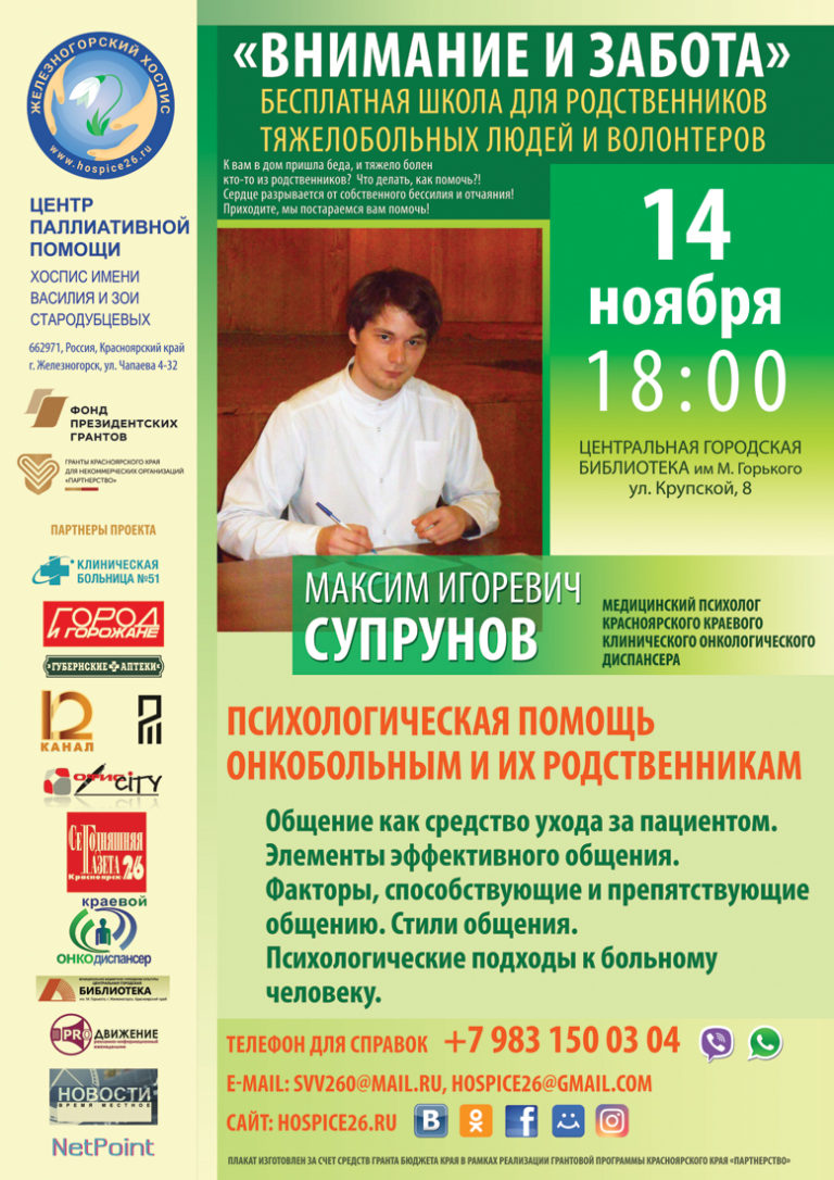 Встреча с медицинским психологом Красноярского онкодиспансера М.И. Супруновым на очередном занятии школы для родственников тяжелобольных и волонтеров «Внимание и Забота» Железногорского хосписа 14 ноября в фотографиях нашего друга и помощника В.В. Нуждина. Открыл занятие директор Железногорского хосписа В. Стародубцев который…