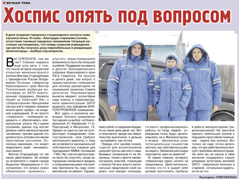 Вопрос о помещении для Железногорского хосписа обозначен в повестке дня городских властей уже более года. Однако место прописки хосписа так и не найдено… Статья «Хоспис опять под вопросом». Опубликована в Сегодняшней газете-26 22 декабря 2016г.